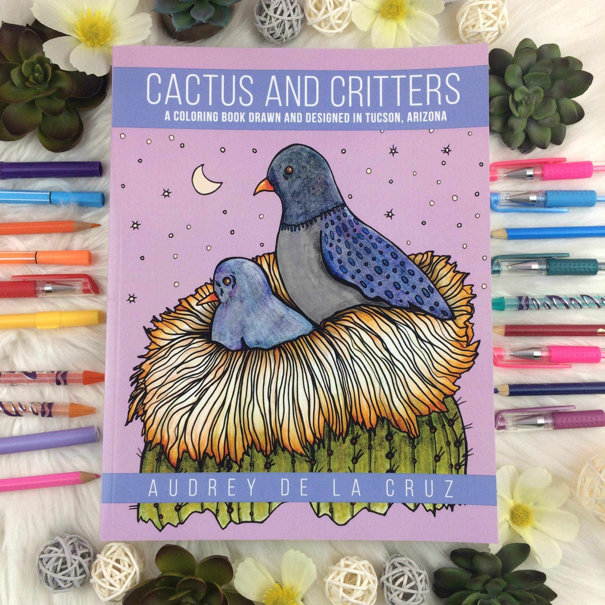 This coloring book features 50 hand-drawn illustrations by Tucson artist, Audrey De La Cruz AKA Annotated Audrey
